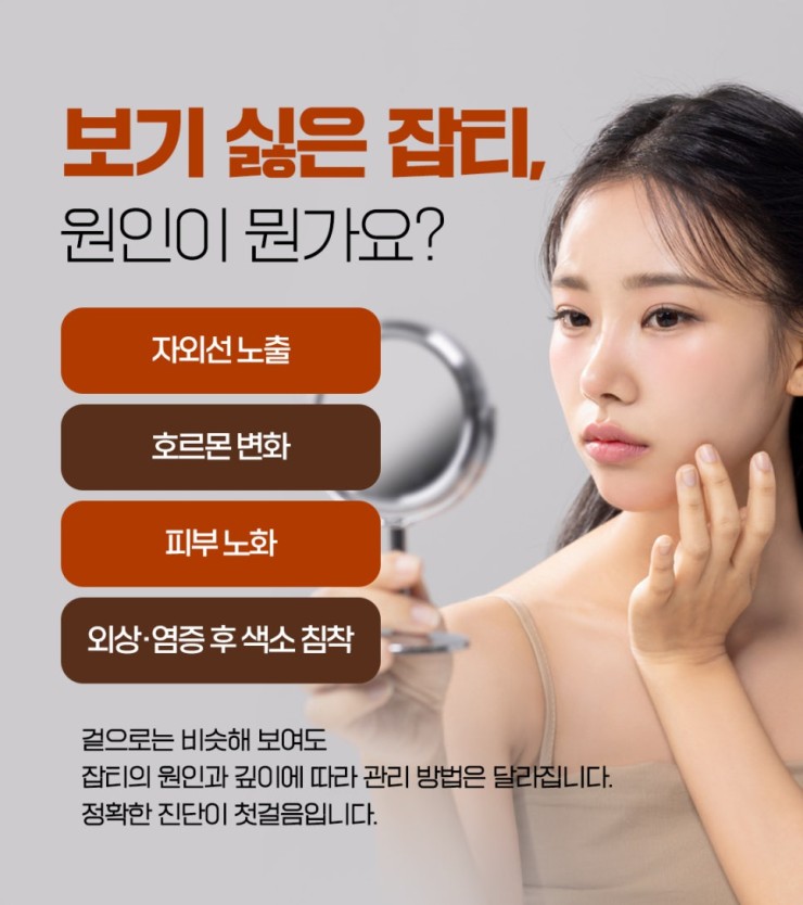 장벽 손상 등 다양한 요인이 관여합니다. 반면 잡티(흑자·주근깨·일광흑자 등)는
