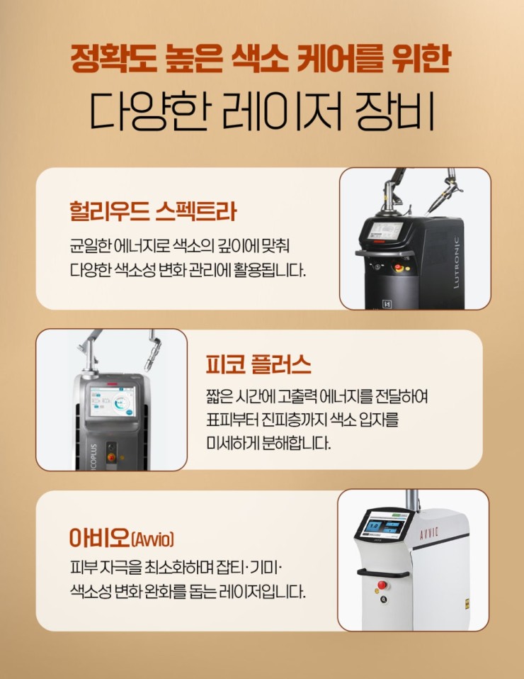 저출력 레이저, 색소 생성 억제제 사용, 자외선 차단, 생활 습관 관리가 병행되어야 안정적인 개선이 유지됩니다. 단기간의