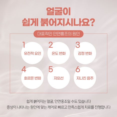 춥거나 더운 날씨, 스트레스, 음주, 긴장 등 사소한 자극에도 얼굴이 쉽게 붉어진다면 단순히 예민한 피부가 아닌