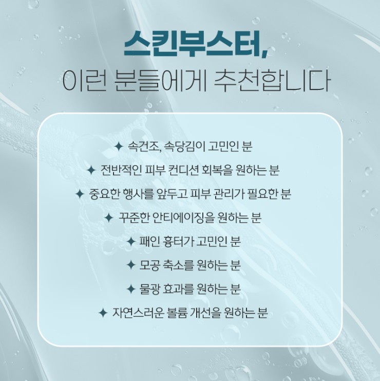 스킨부스터는 다음과 같은 피부 고민을 가진 분들에게 적극 추천됩니다.