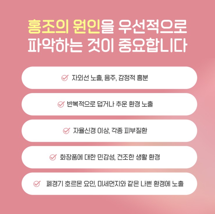 홍조는 하나의 원인으로 발생하지 않습니다. 햇빛이나 온도 변화, 감정적 스트레스, 음주, 매운 음식 섭취 등 혈관을 확장시키는 다양한 요인들이 복합적으로 작용합니다. 특히 계절이 바뀌는 가을철에는 낮과 밤의 온도 차가 커지고, 건조한 공기와 미세먼지 등 외부 자극이 심해지면서 피부 혈관이 더욱 예민하게 반응하게 됩니다. 또한 피부 장벽이 약화되어 외부 자극에 쉽게 반응하는 민감성 피부, 또는 폐경기 이후 호르몬 변화로 인한 혈관 불안정성 역시 주요 원인입니다. 이처럼 홍조는 생활 습관, 환경, 체질이 복합적으로 작용해 나타나므로, 단순한 크림이나 진정팩으로는 근본적인 개선이 어렵습니다.