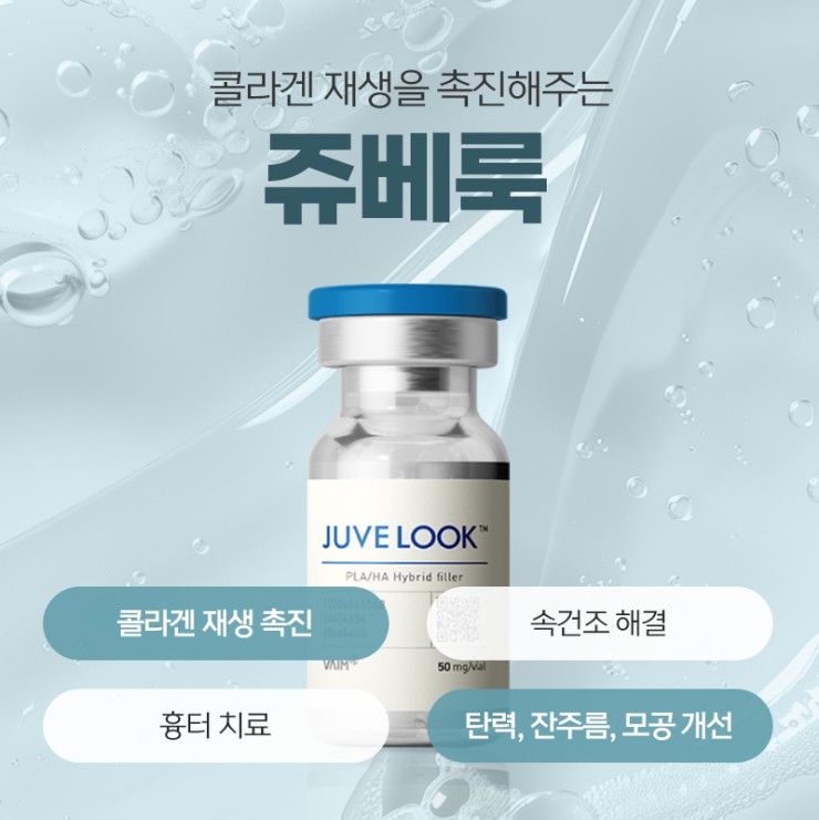 쥬베룩(Juvelook)은 콜라겐 재생을 강력하게 유도하는 스킨부스터로, 속건조·잔주름·모공·탄력 저하뿐 아니라 여드름 흉터 개선에도 효과적입니다. 시술 후 시간이 지날수록 피부 속 콜라겐이 서서히 재구성되기 때문에 점진적이고 자연스러운 피부 탄력 상승을 경험할 수 있습니다. 탄력 저하가 빠르게 진행되는 30~40대에게 특히 추천되는 제품입니다. 또한 쥬베룩 볼륨(Juvelook Volume)은 이름 그대로 자연스러운 볼륨 보충에 특화되어 있으며, 필러처럼 즉각적인 부피감보다는 서서히 차오르는 자연스러운 볼륨과 탄력감을 부여하는 것이 특징입니다. 꺼진 부위나 볼 패임, 얼굴 윤곽 라인을 자연스럽게 보정하는 데 효과적이며 부담감이 덜한 점이 가장 큰 장점입니다.